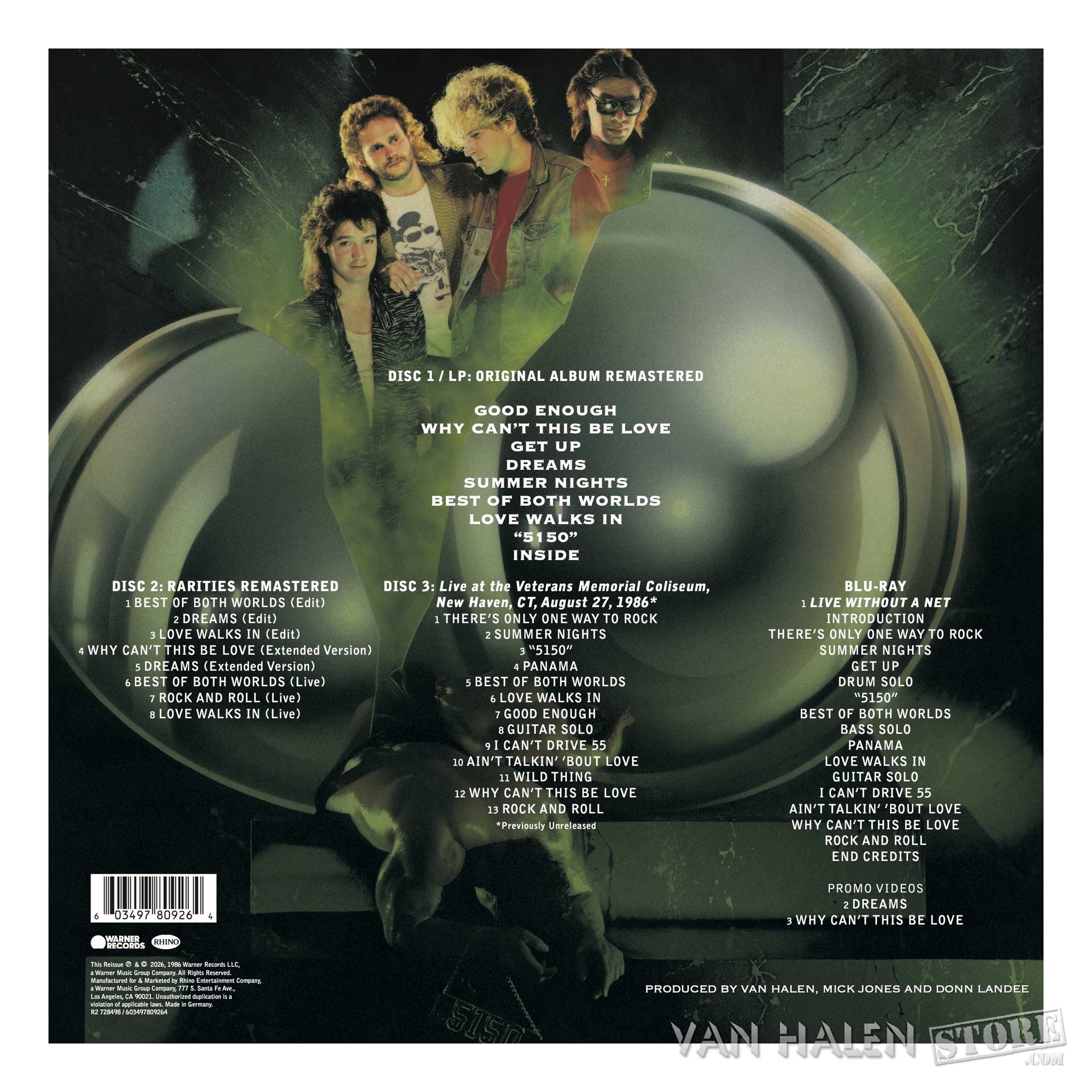 The Blu-ray includes a new high-definition upgrade of Live Without a Net, Van Halen's double-Platinum 1986 concert video that was also recorded that same August night in New Haven, along with promotional videos for "Dreams" and “Why Can’t This Be Love."