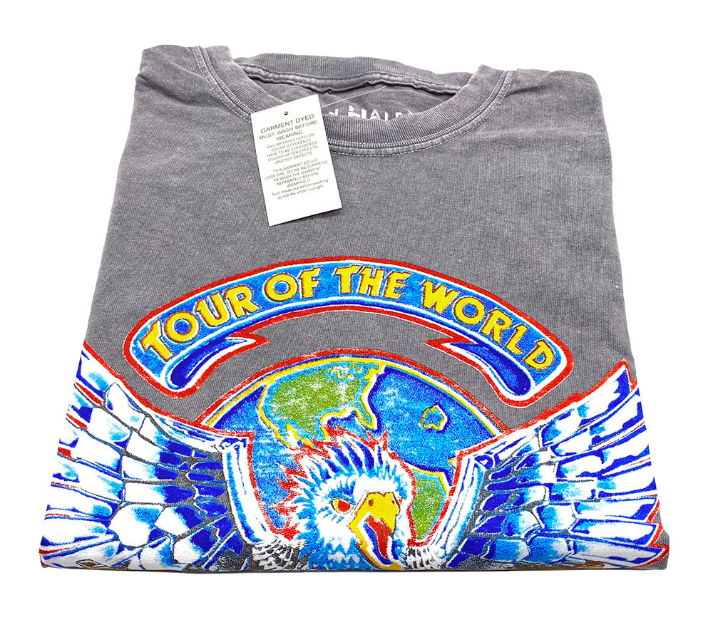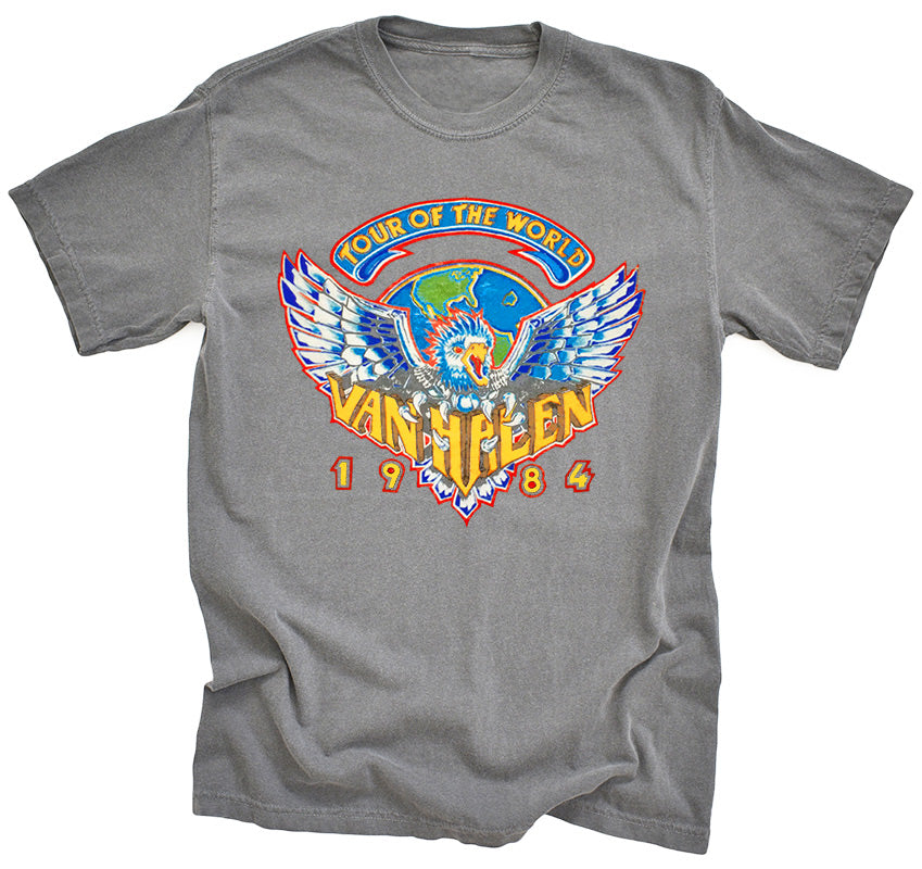 Van Halen's classic 1984 eagle logo looks AMAZING printed in bright colors on this vintage-washed grey tee.