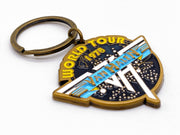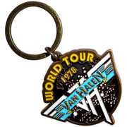 This retro-style keychain features a textured design that commemorates Van Halen's legendary first world tour. It has an antique bronze finish and is filled with enamel.