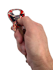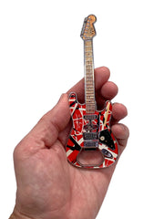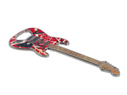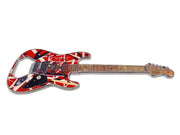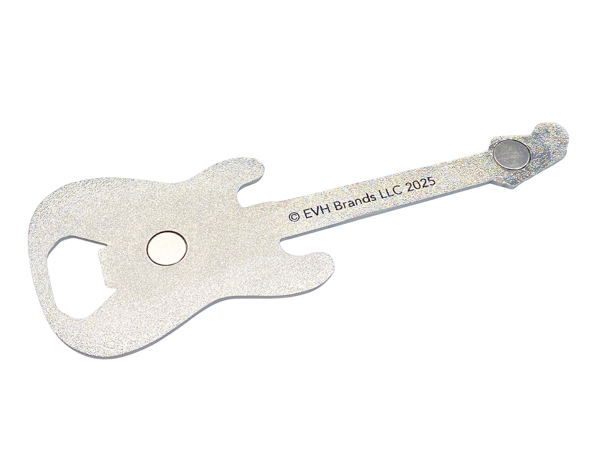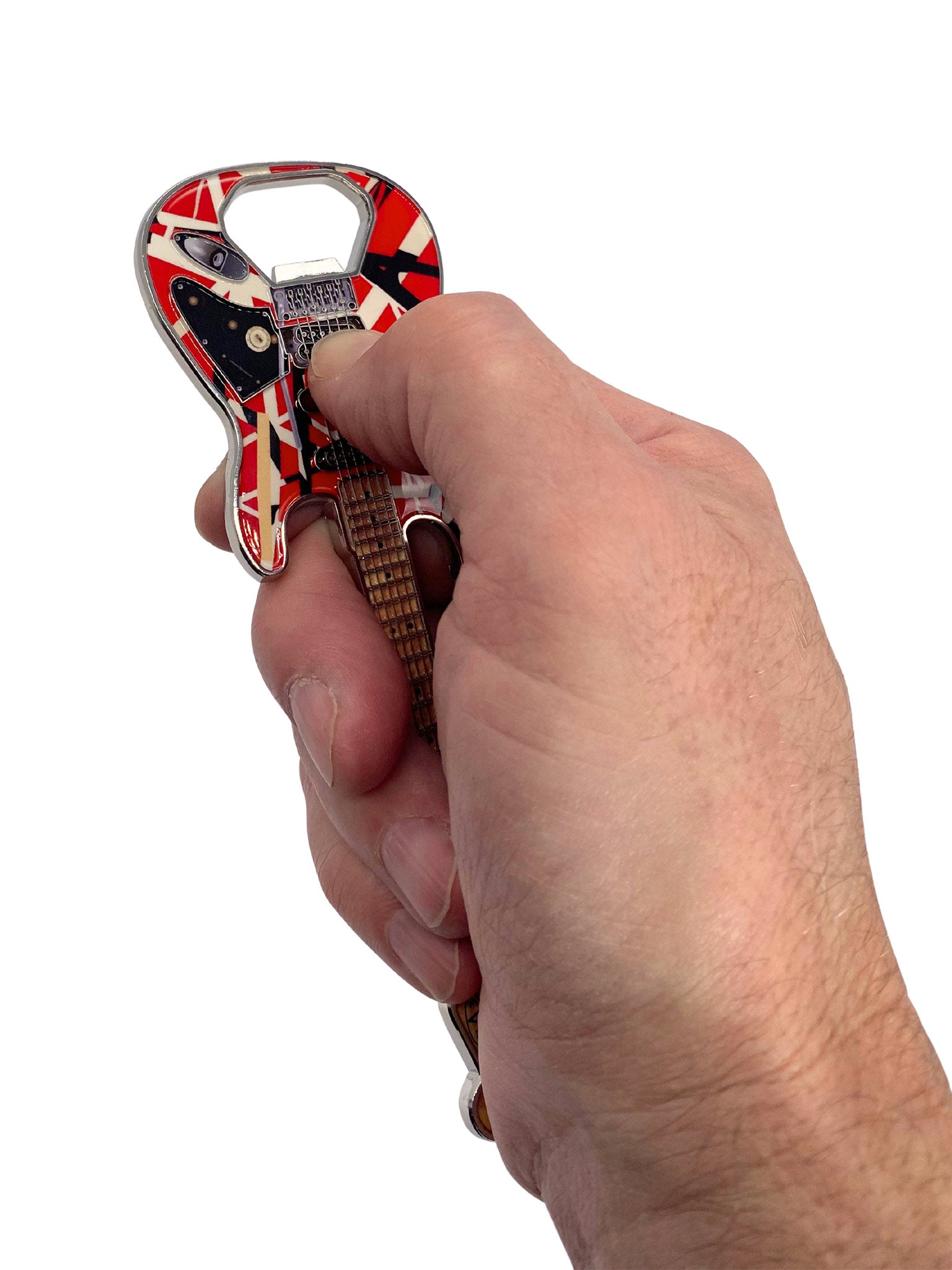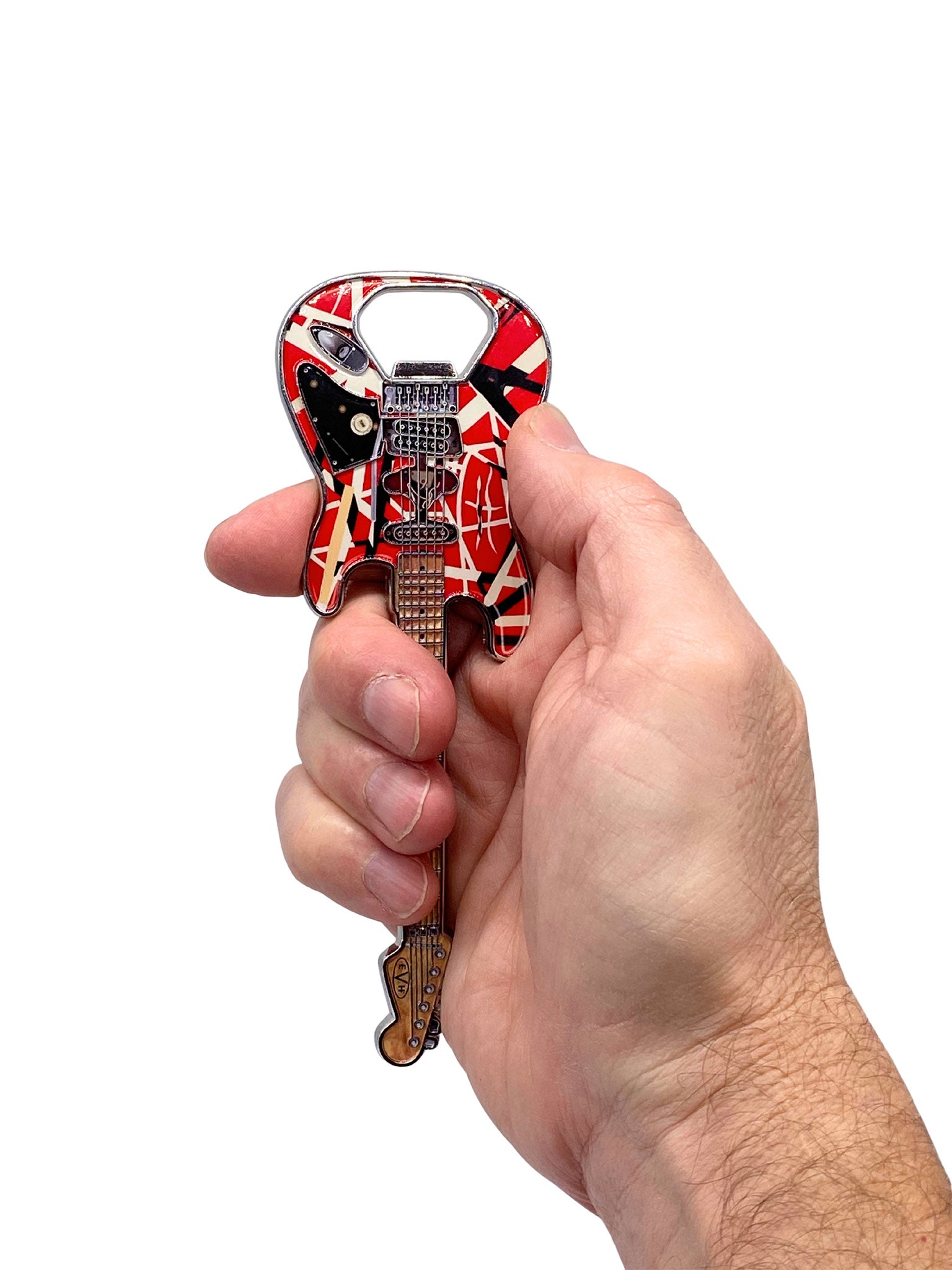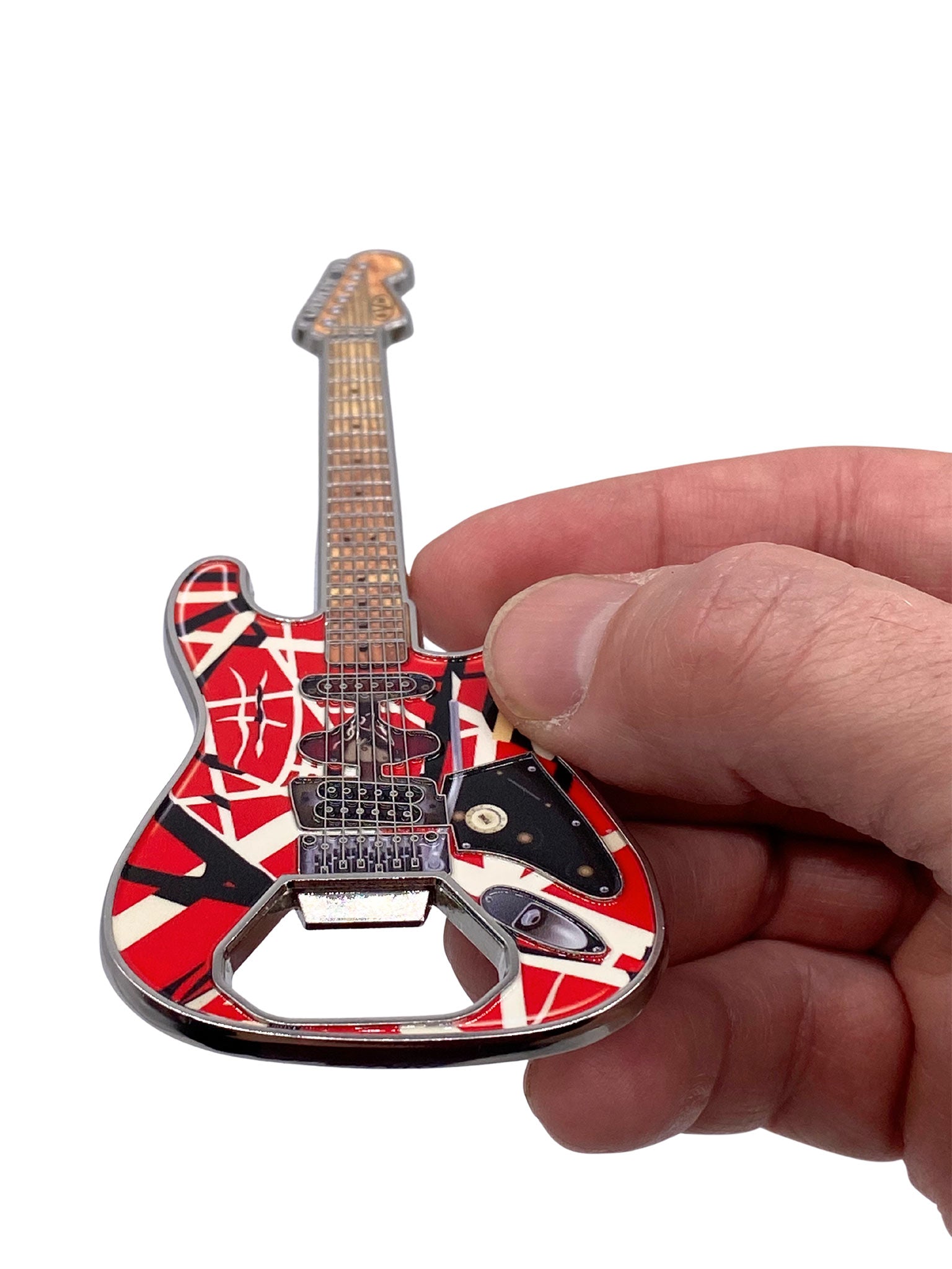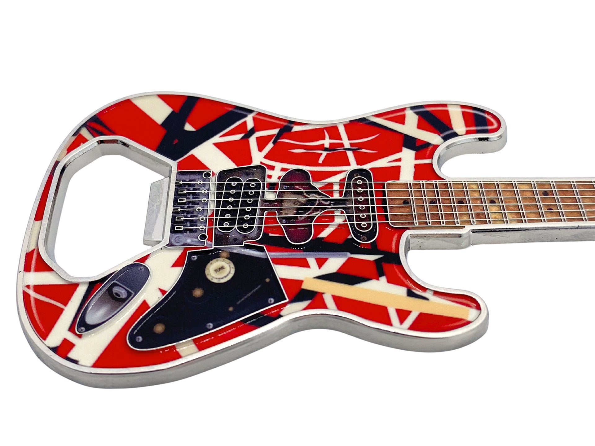 Open your favorite beverage in true Van Halen style with a custom-designed bottle opener that also serves as a rockin' magnet. This gem takes the shape of one of the most iconic guitars in rock history — Eddie Van Halen's "Frankenstein" guitar, instantly recognizable by its distinctive red, white, and black stripes.