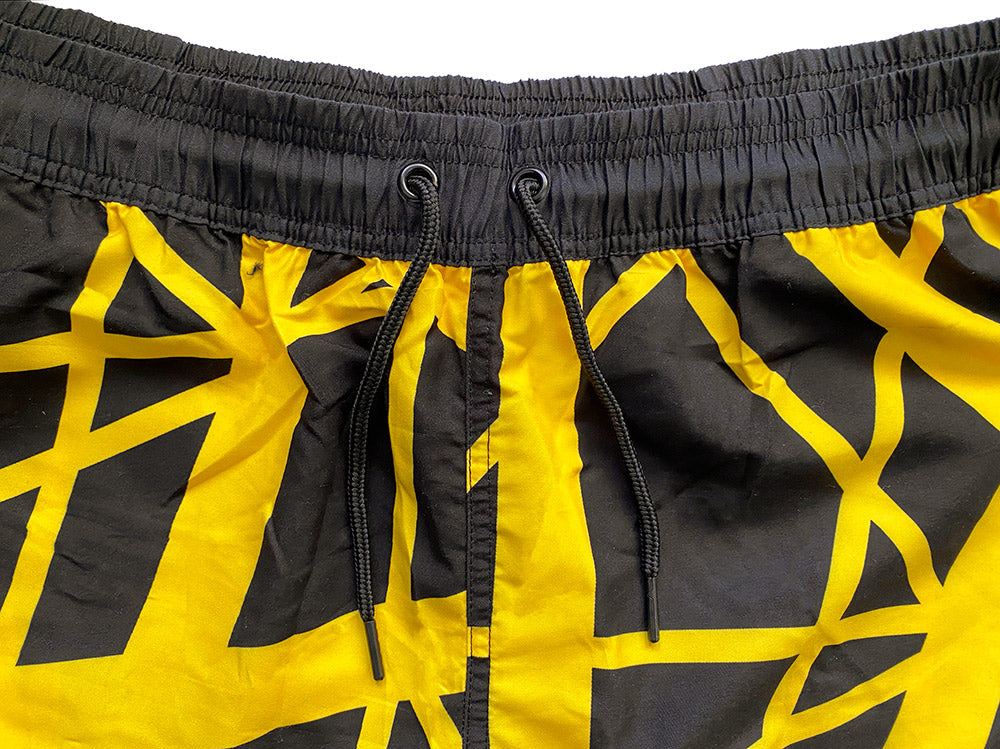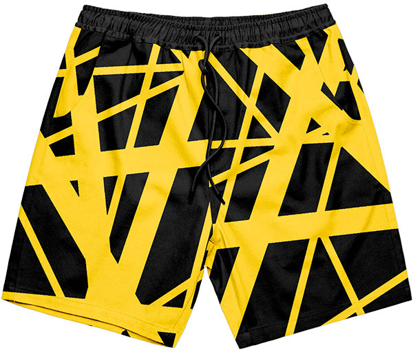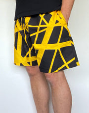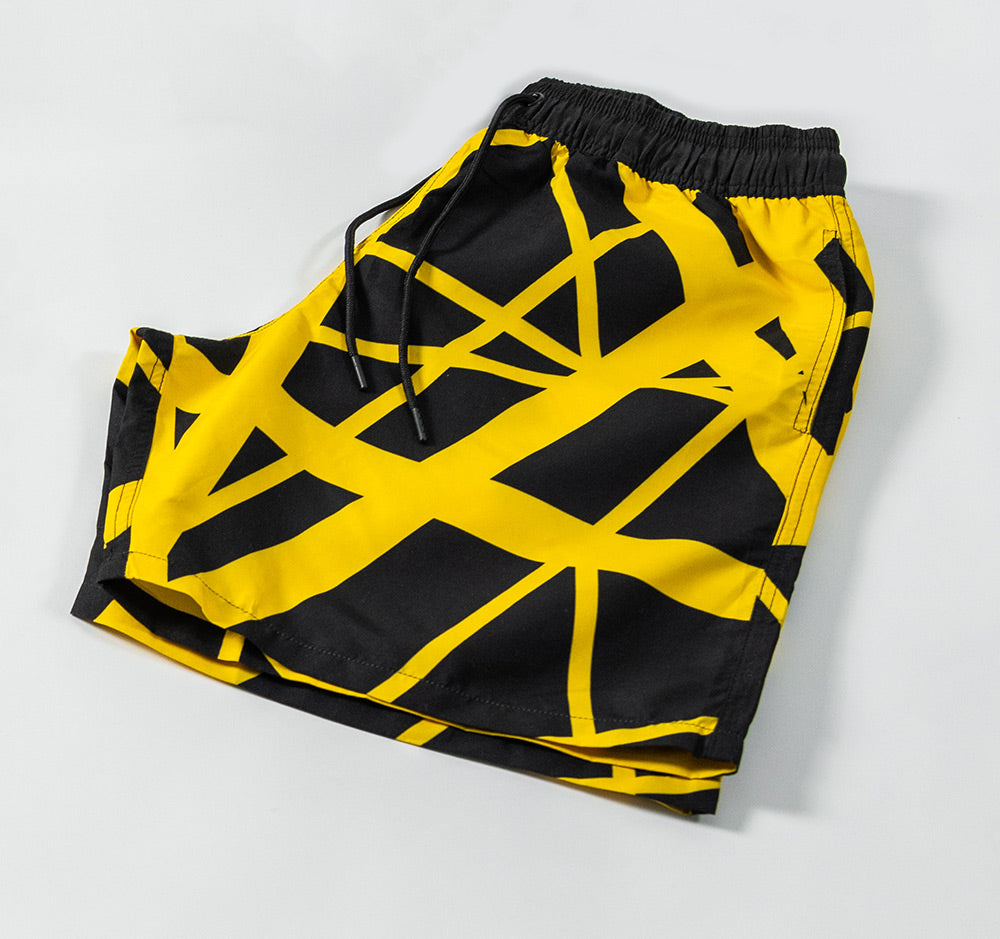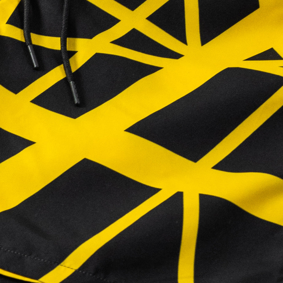 Black and Yellow Swim Shorts inspired by Eddie Van Halen’s "Bumblebee" guitar pictured on the cover of Van Halen II.