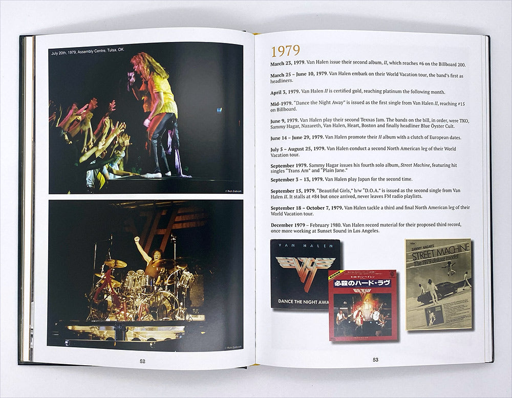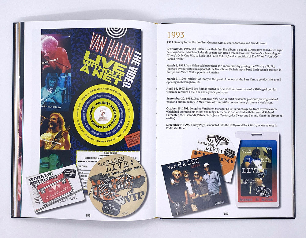 This visually stunning book spans 224 pages. With roughly 330 images—over half being electrifying live shots from five decades of guitar mastery—the remainder showcases rare memorabilia, magazine ads, 45 sleeves, promo items, ticket stubs, and passes. For the first time in a Van Halen coffee table book, both David Lee Roth’s and Sammy Hagar’s solo careers are included. An exquisitely detailed, nearly 20,000-word timeline traces the band’s storied career.