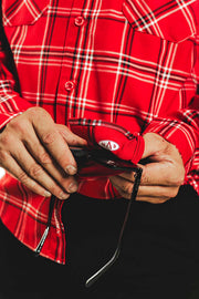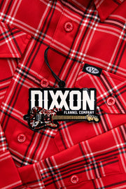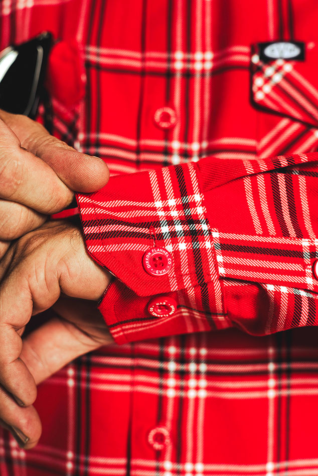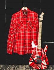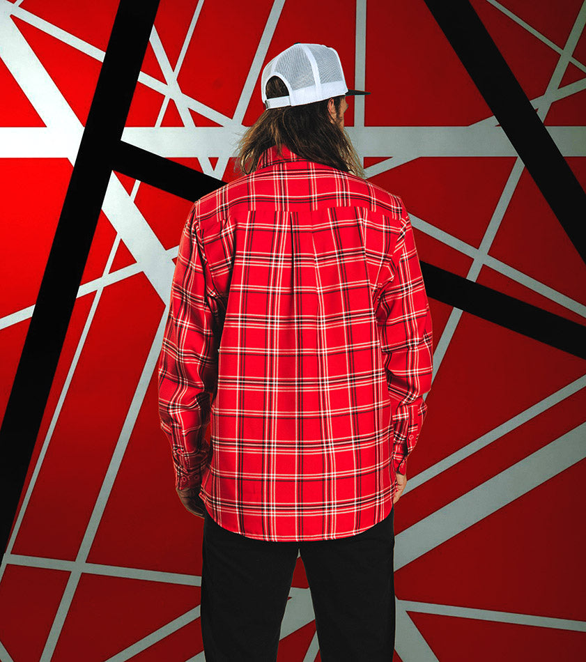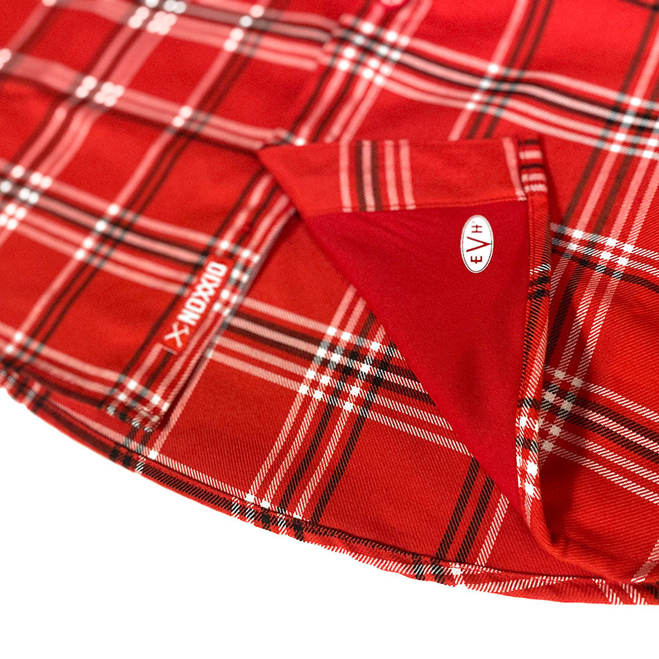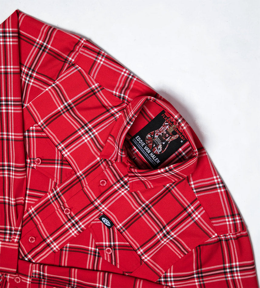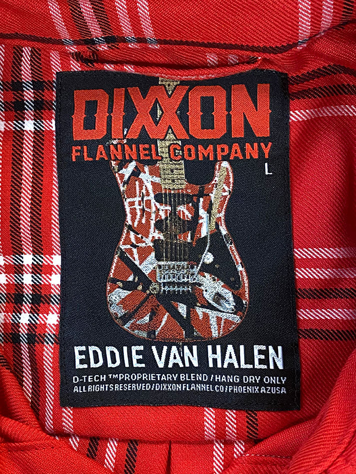 A tribute to the 45th anniversary of Eddie’s world-famous Frankenstein Guitar, the Eddie Van Halen Eruption Flannel features an allover red, black, and white plaid pattern that offers a clean and classic design, while Dixxon’s signature D-Tech™ blend provides the comfort of soft-to-the-touch flannel.
